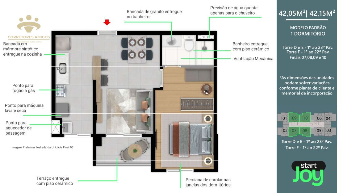 - 1 e 2 dormitórios: Opções para solteiros, casais e pequenas famílias, todos com terraço para você aproveitar os momentos de lazer.