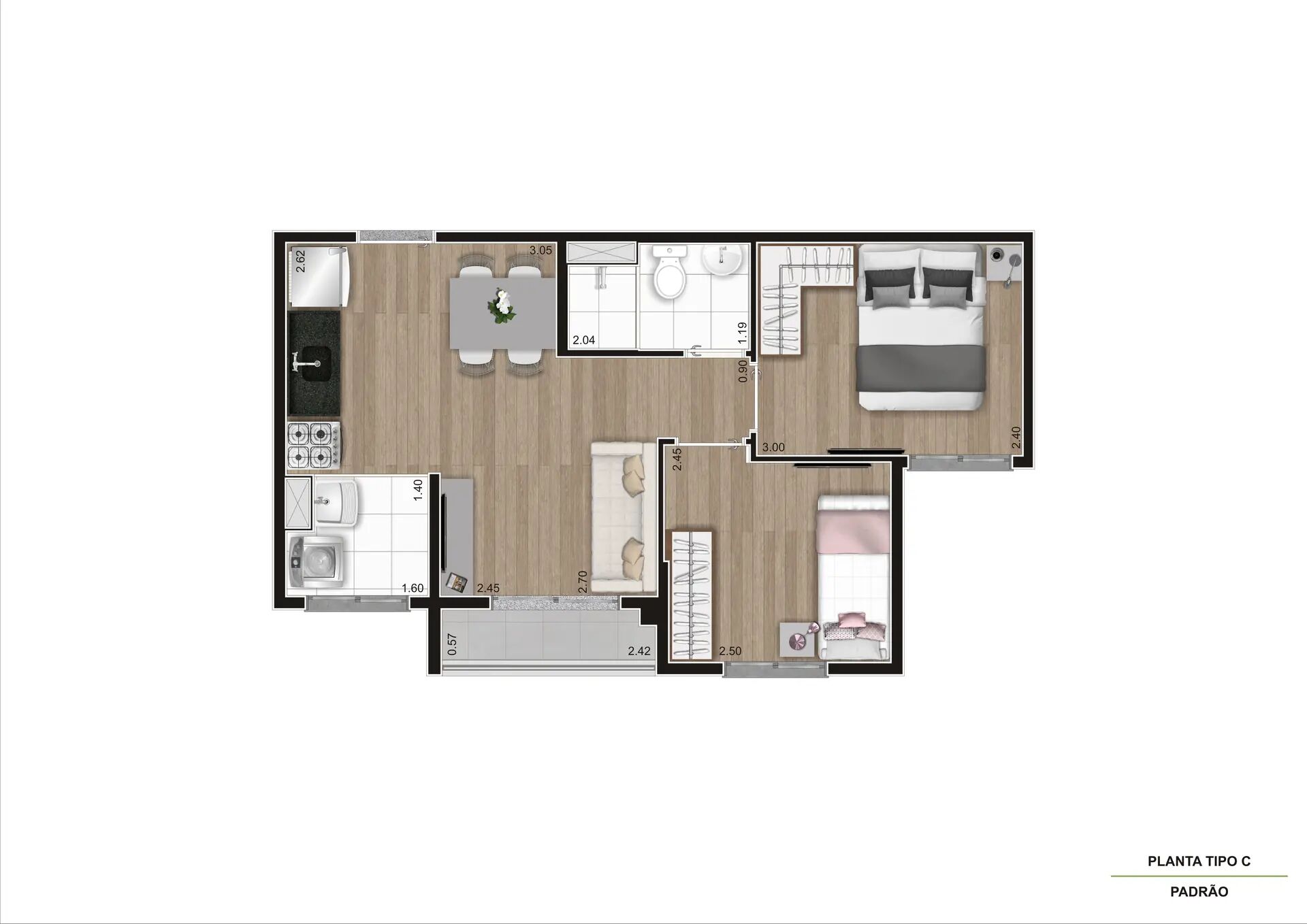 44 m² – 2 dorms. com terraço (Tipologia B) – 36 unidades