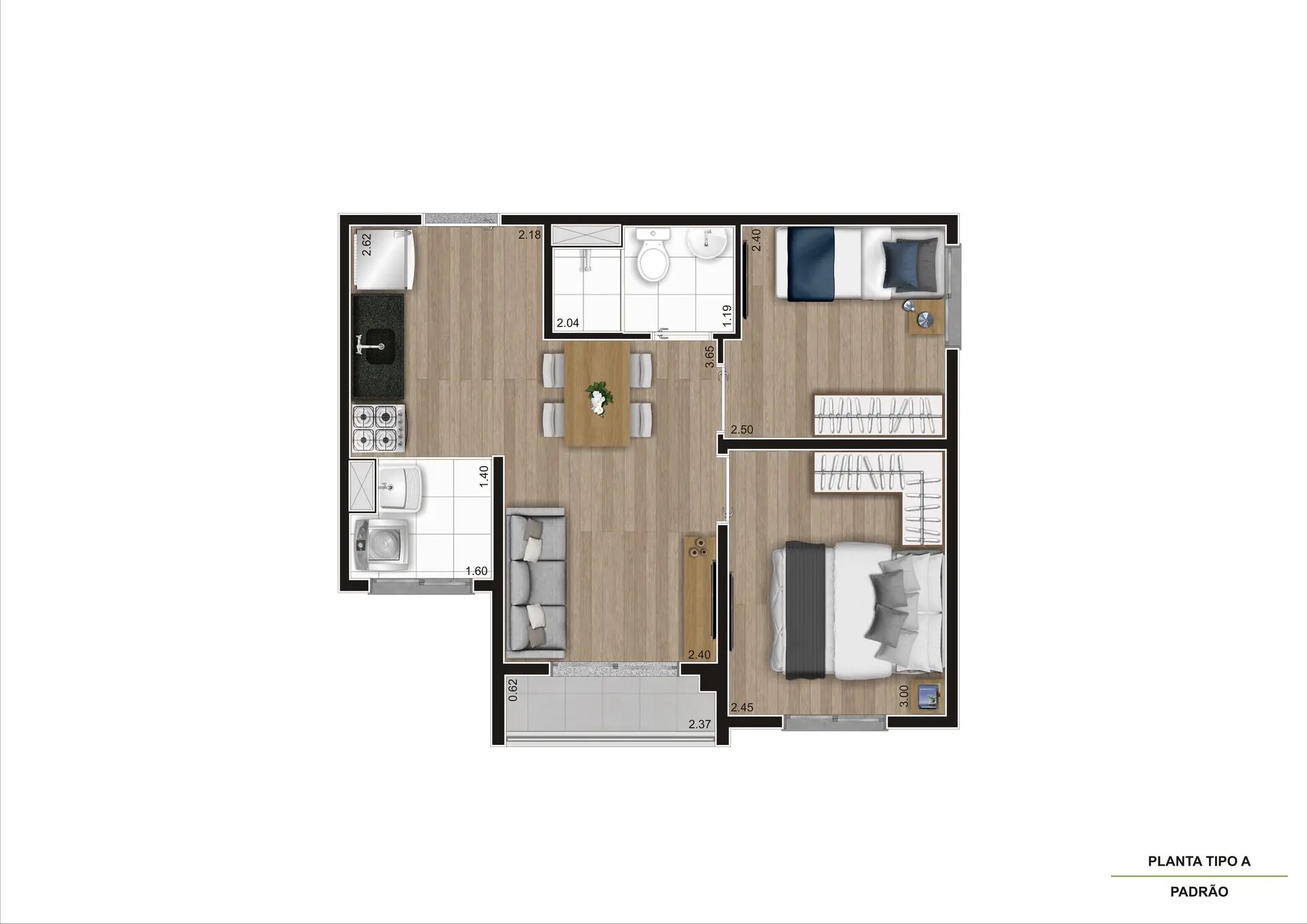 38 m² – 2 dorms. com terraço (Tipologias A e C) – 288 unidades